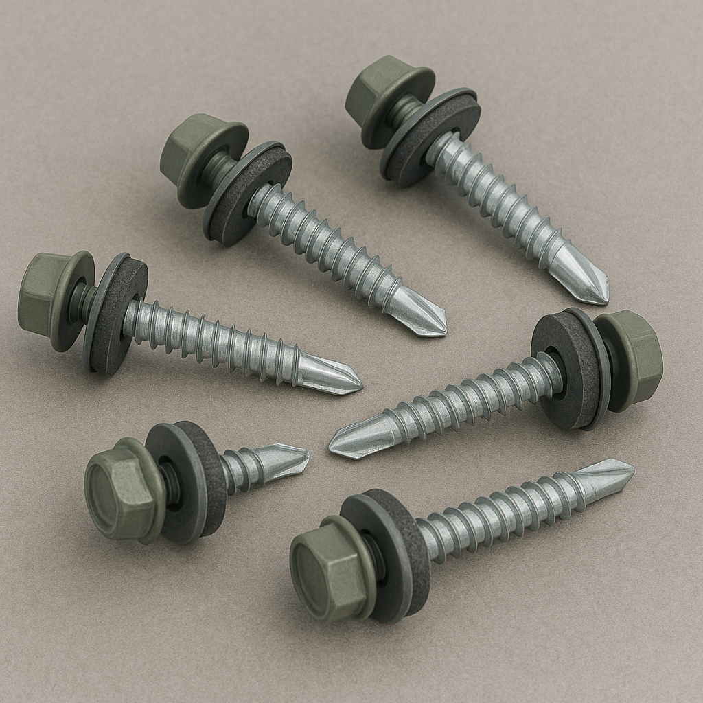 Tornillos autorroscantes diseñados para fijar láminas metálicas a estructuras. Aseguran una instalación firme, duradera y resistente a la vibración o al viento. Disponibles en distintos tamaños y tipos.